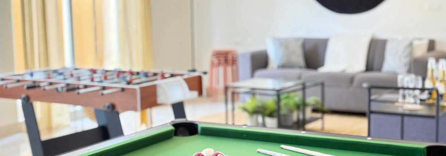 Welcome to The Leo’s Haus — a vibrant 4 bedroom, pet-friendly villa in Jaipur designed for unforgettable getaways. With Scandinavian interiors, jacuzzi, snooker, foosball, board games, and a retro console - perfect for game nights, chill weekends, or celebrations. Enjoy cozy bedrooms, an open-plan living space, a fully equipped kitchen. Whether relaxing or turning up the vibe, every moment here is made to connect, play, and unwind. ❶ Sophisticated Living Space: